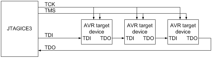 Flera AVR:er kan kopplas i en s k JTAG-kedja då det sedan blir möjligt att via Atmel Studio välja vilken av AVR:erna som man för ögonblicket vill programmera eller emulera. Inkoppling sker på samma sätt som för en enda AVR, men med en liten skillnad. Signalerna TCK och TMS kopplas parallellt till alla AVR:er i kedjan. Signalen TDI kopplas till den första AVR:ens TDI, TDO på den första AVR:en kopplas till TDI på nästa AVR o s v, och TDO på den sista AVR:en i kedjan kopplas tillbaka till JTAG-burkens TDO.