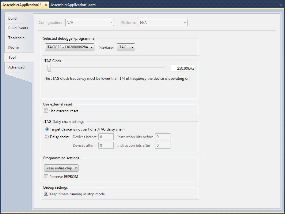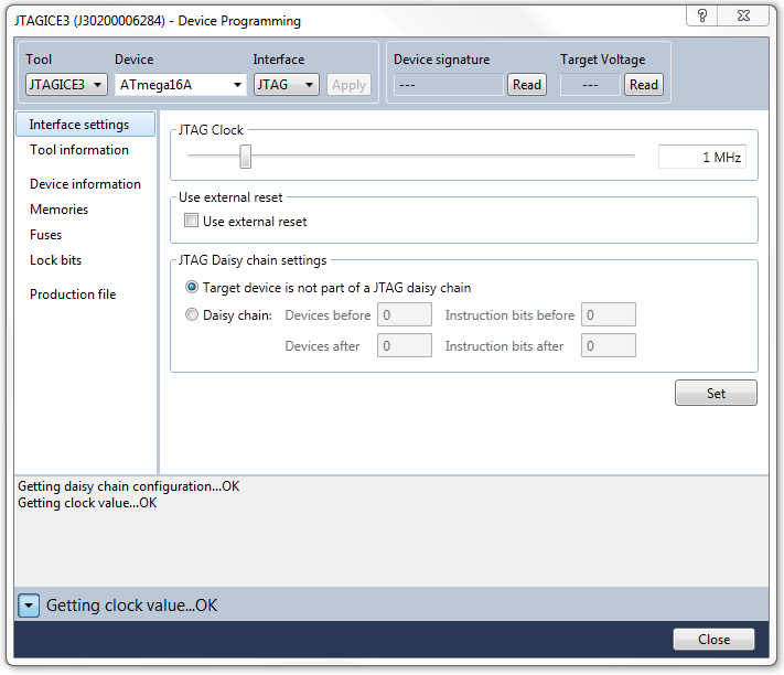 Som "Selected debugger/programmer" välj "JTAGICE3" och till "Interface:" välj "JTAG". Viktigt är också att "JTAG Clock" är inställd på en frekvens som är lägre än 1/4 av klockfrekvensen för mikrokontrollern. Använder man dessutom en JTAG-kedja (JTAG Daisy chain) så måste inställningarna för denna vara korrekt (se JTAG-kedja nedan).