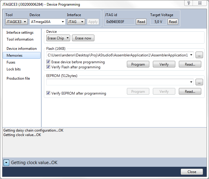 I rutan "Flash (16KB)" anger man namnet på den kompilerade hex-filen för projektet och klickar sedan på "Program". Går allt bra ska det stå "Verifying Flash...OK" längst ned. Här kan man även, i rutan "EEPROM (512bytes)", ange den hex-fil som man eventuellt vill programmera i AVR:ens EPROM-minne. Förväxla inte detta med programminnet.