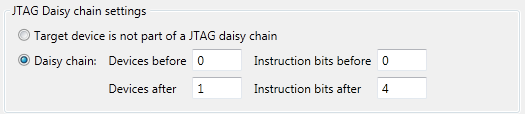 OBSERVERA, att om man nu använder sig av en JTAG-kedja (JTAG Daisy chain, se nedan) så måste inställningarna för kejdan vara korrekta för att programmering av kretsen och dialogrutan ska fungera korrekt. Får man något felmeddelande så bör man kontrollera inställningarna samt virningarna för själva JTAG-kedjan. Dessa inställningar för JTAG-kedjan gäller bara vid programmering. För emulering (debugging) gäller andra inställningar (se nedan).